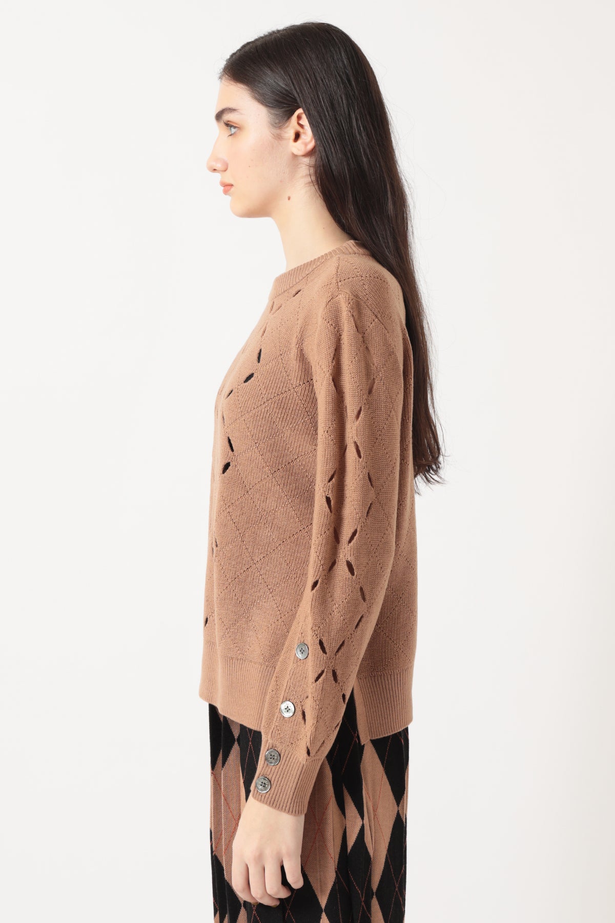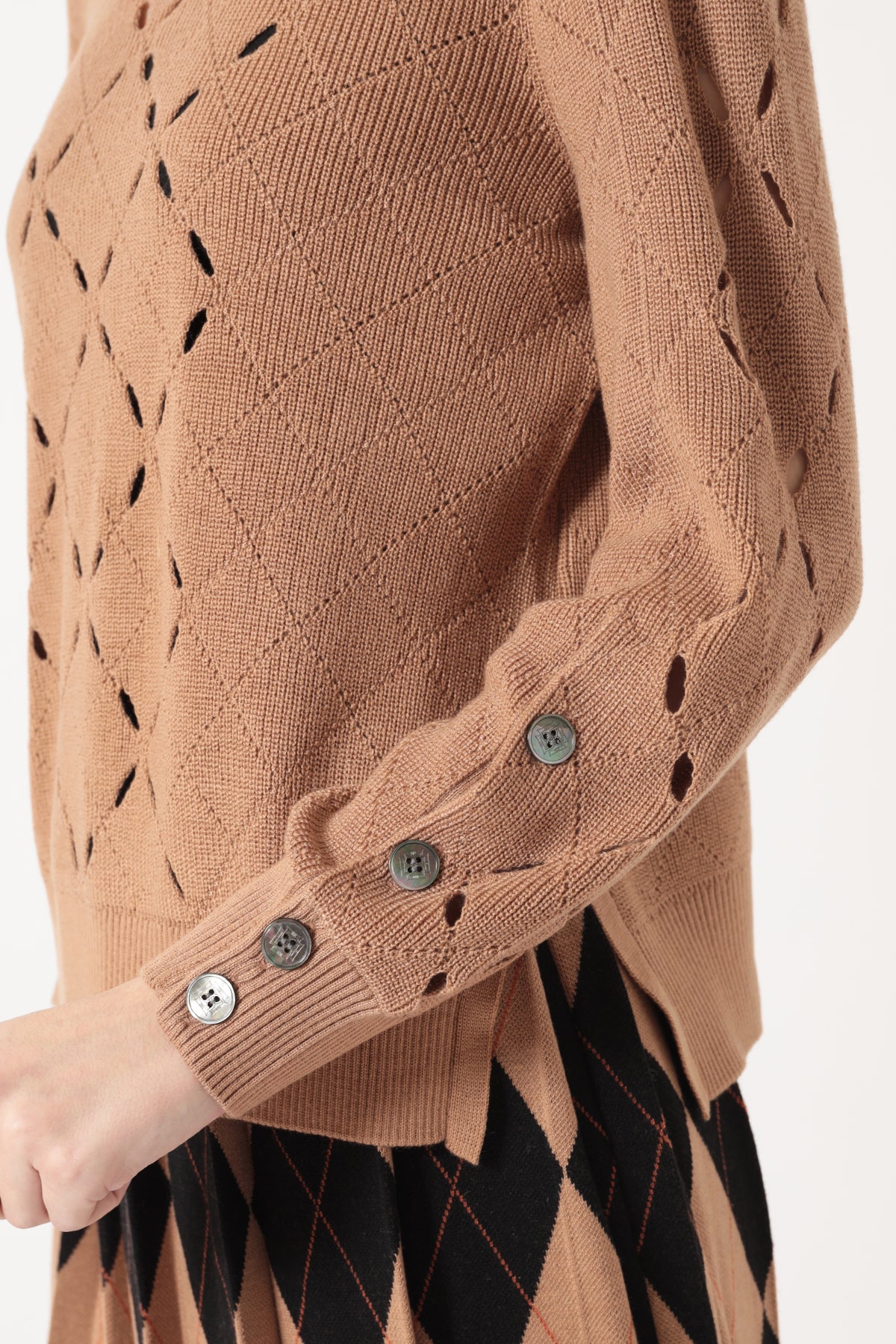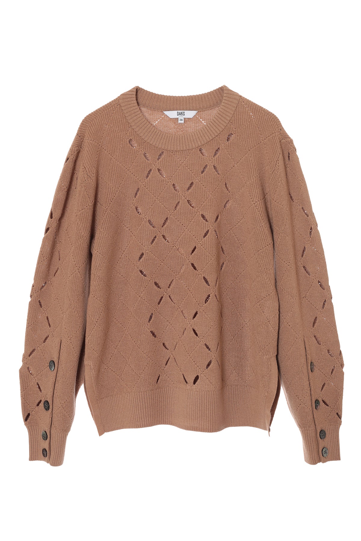 A modern crew‑neck pullover with a distinctive diamond pattern and sheer knit texture. The openwork design reveals your inner layer for a chic, fashion‑forward look. Sleeve buttons add versatility, letting you style it freely with layered combinations. A high‑design knit that elevates everyday outfits with effortless sophistication.