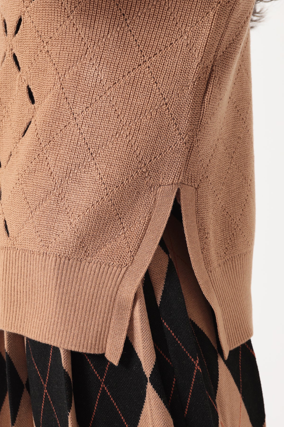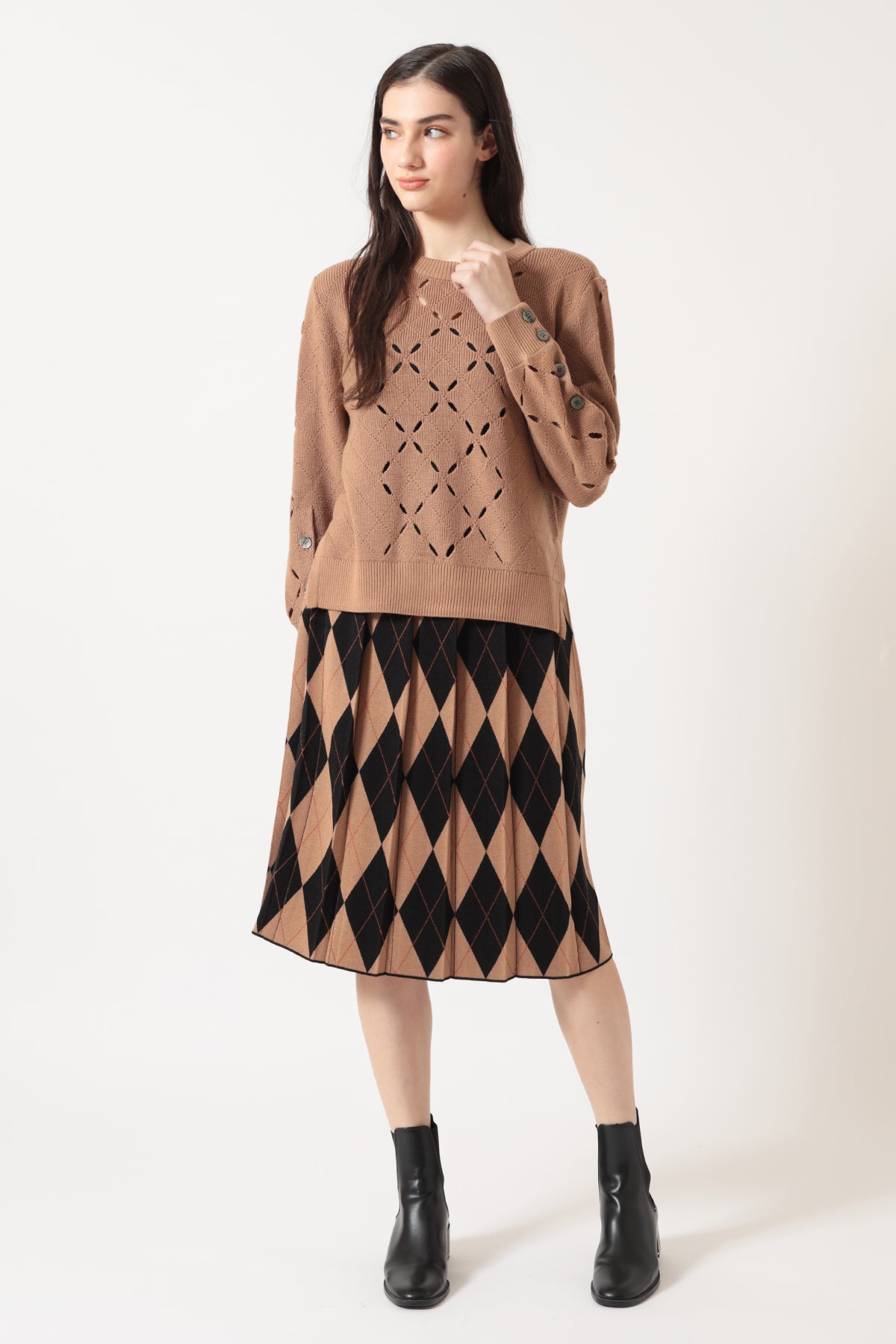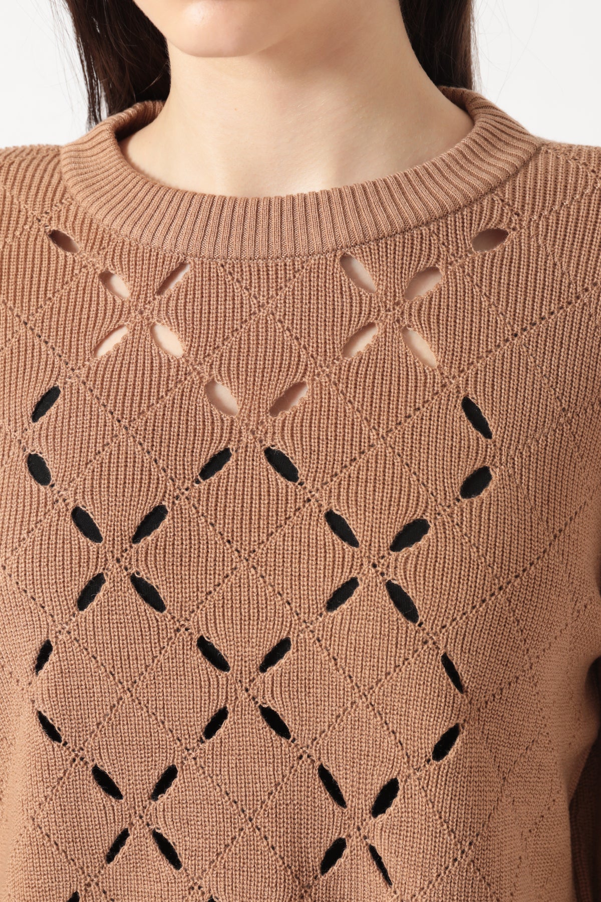 A modern crew‑neck pullover with a distinctive diamond pattern and sheer knit texture. The openwork design reveals your inner layer for a chic, fashion‑forward look. Sleeve buttons add versatility, letting you style it freely with layered combinations. A high‑design knit that elevates everyday outfits with effortless sophistication.